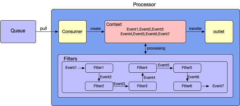 • The Processor module is responsible for reading data from the queue and processing data by a series of filter chains.