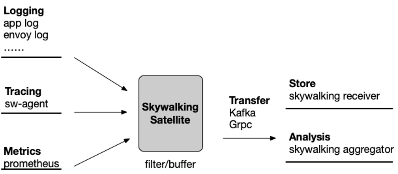 Satellite is a 2 level system to collect observability data from other core systems. So, the core element of the design is to guarantee data stability during Pod startup all the way to Pod shutdown avoiding alarm loss. All modules are designed as plugins, and if you have other ideas, you can add them yourself.