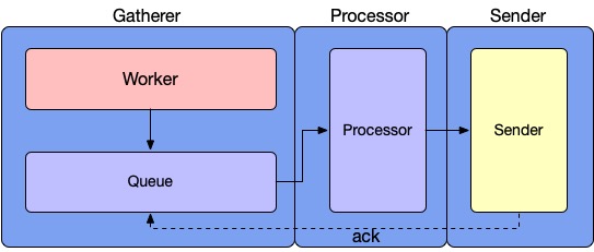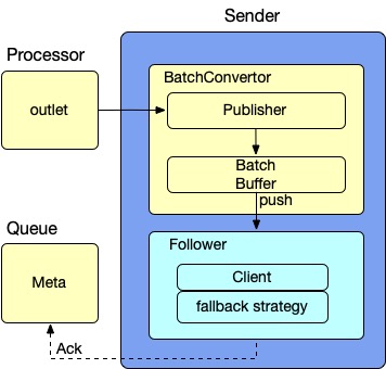 • The Sender module is responsible for async processing and forwarding the data to the external services in the batch mode. After sending success, Sender would also acknowledge the offset of Queue in Gatherer.