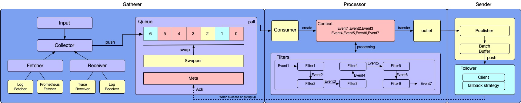 4. The Queue is a buffer module to decouple collection and transmission. In the 1st release version, we will use persistent storage to ensure data stability. But the implementation is a plug-in design that can support pure memory queues later.