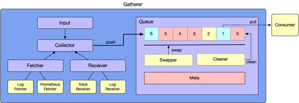 • The Gatherer module is responsible for fetching or receiving data and pushing the data to Queue.