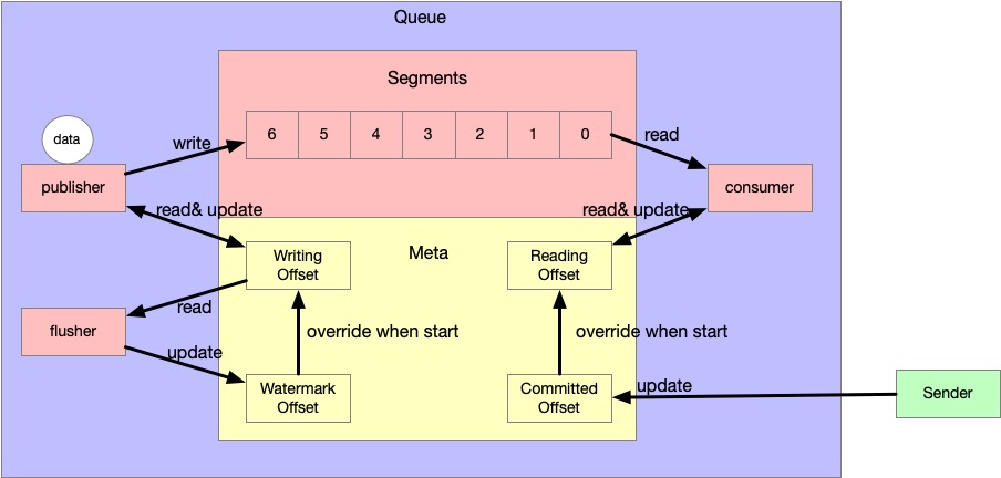 One MmapQueue has a directory to store the whole data. The Queue directory is made up with many segments and 1 meta file. The number of the segments would be computed by 2 params, which are the max cost of the Queue and the cost of each segment. For example, If the max cost is 512M and each segment cost is 256K, the directory can hold up to 2000 files. Once capacity is exceeded, an coverage policy is adopted that means the 2000th would override the first file.