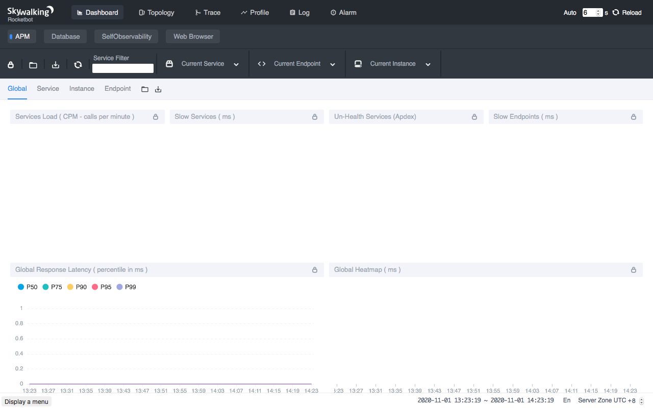 现在到你的浏览器上访问 http://localhost:8080。你应该会看到 SkyWalking 的 Dashboard。 Dashboard 现在应该是空的,但稍后部署应用和生成流量后,它就会被填满。