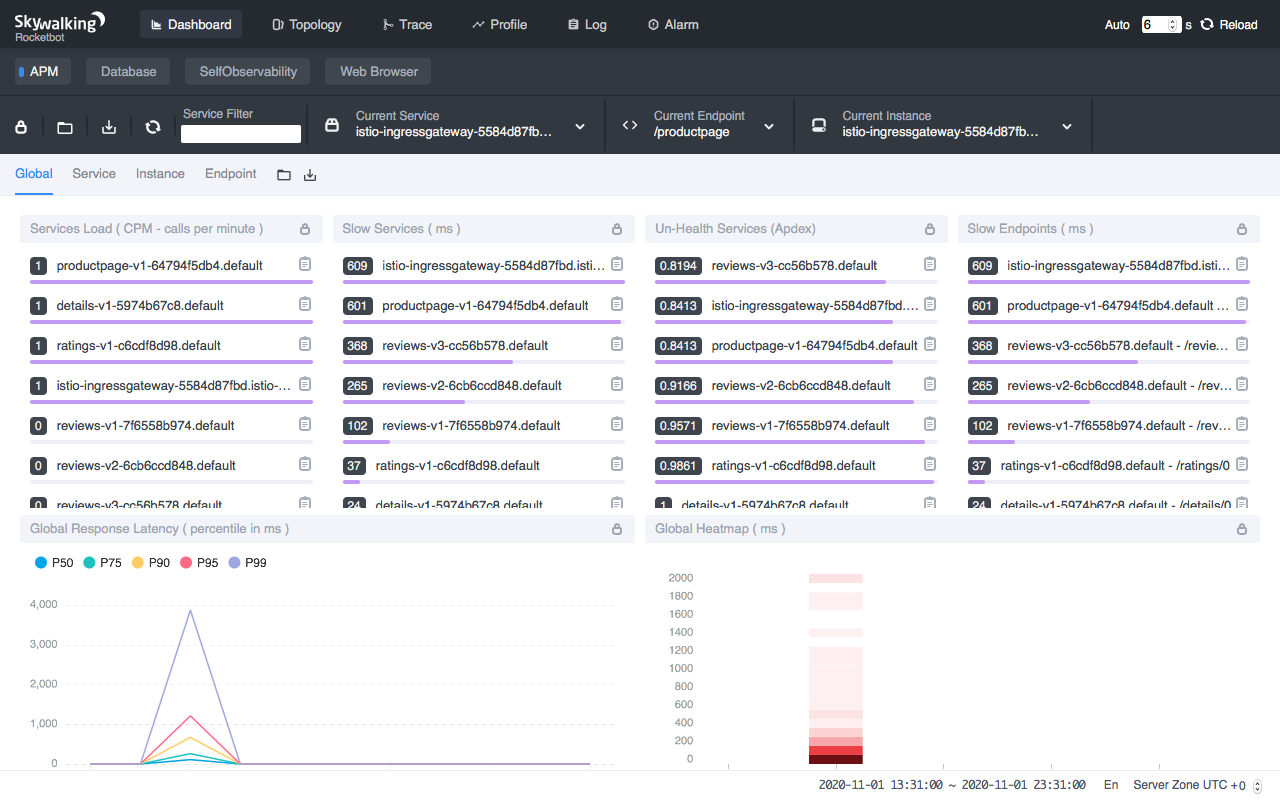 这样做,你就成功完成设置了!再查看 SkyWalking 的 WebUI,你应该会看到 bookinfo 应用的拓扑,以及它每一个单独服务的指标数据。